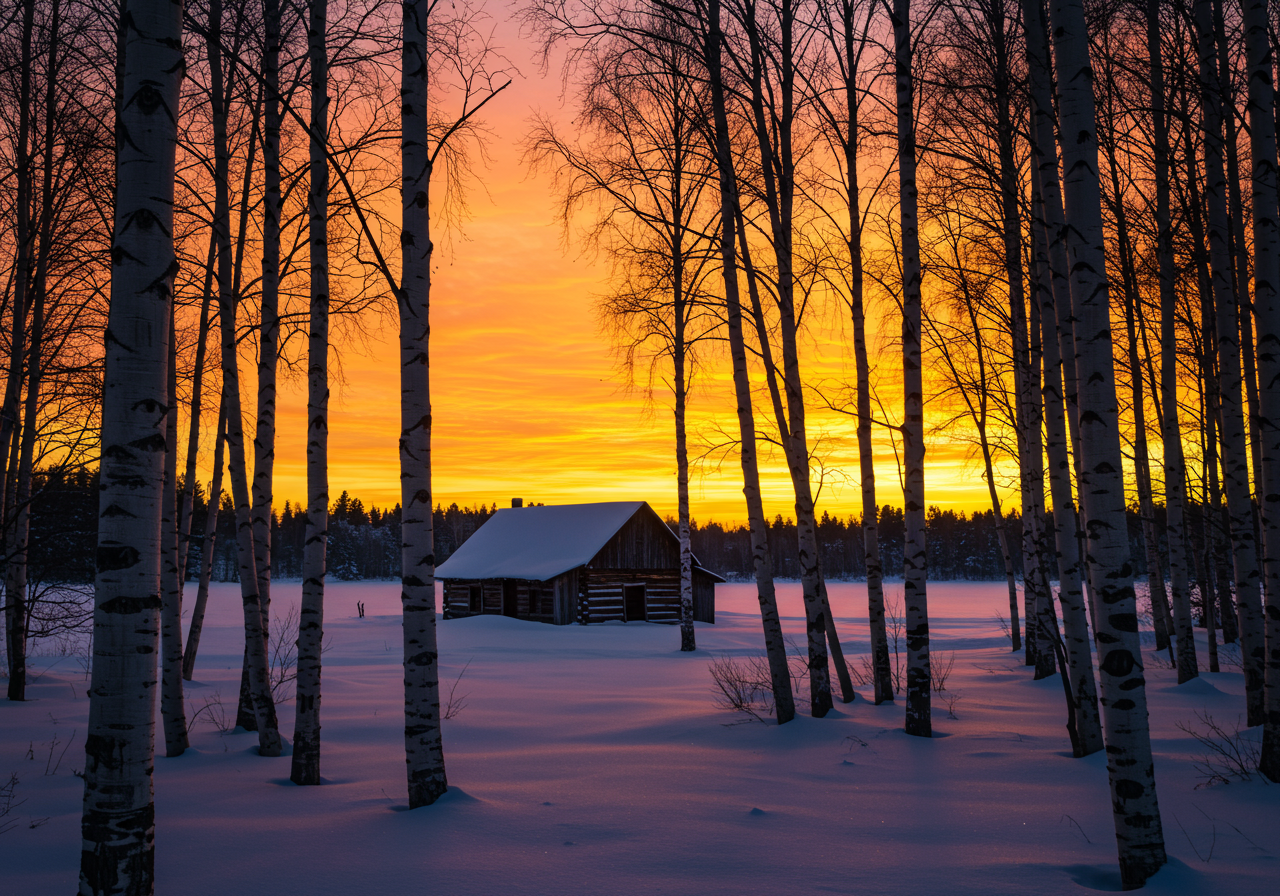 Winter sunset: house and bare aspens in snow, Cordillera, Colorado
