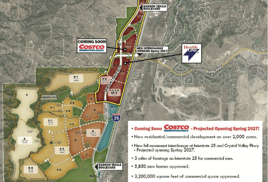 The Dawson Trails project encompasses more than 2,000 acres west of Interstate 25 off the new Crystal Valley Interchange. This large-scale development will include 5,850 residential units (single-family and multifamily), 3.2 million square feet of commercial space, approximately 750 acres of parks and open space, and yes — a Costco!